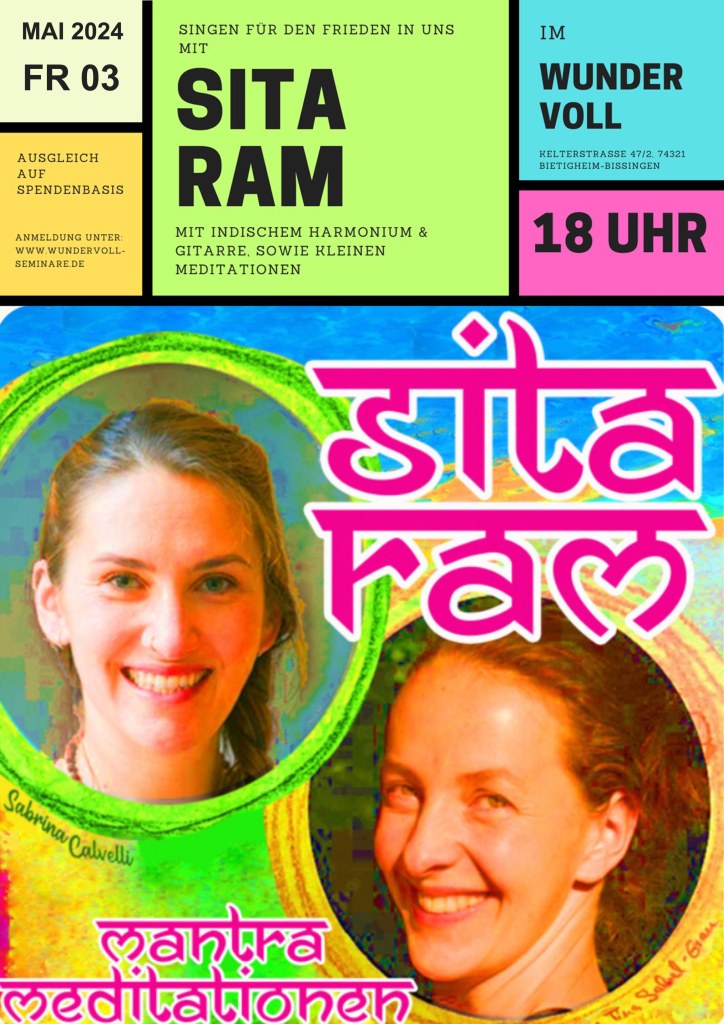 Tina und Sabrina gründeten die Mantra Gruppe SITA RAM im Januar 2023, inspiriert durch ihren spirituellen Lehrer Charlie Pils. Seitdem ist die Gruppe für viele eine Quelle von Freude und Kraft, Ruhe und Inspiration. Wir wachsen gemeinsam im Vertrauen in die Kraft der Mantras. Richten uns immer wieder aus im Weg des Herzens, schulen uns in Weisheit und Mitgefühl.